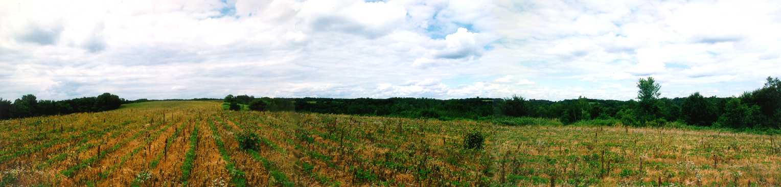 The western field -- a panorama looking north and east. Roundup-ready soybeans poking through the weeds that have just been sprayed.