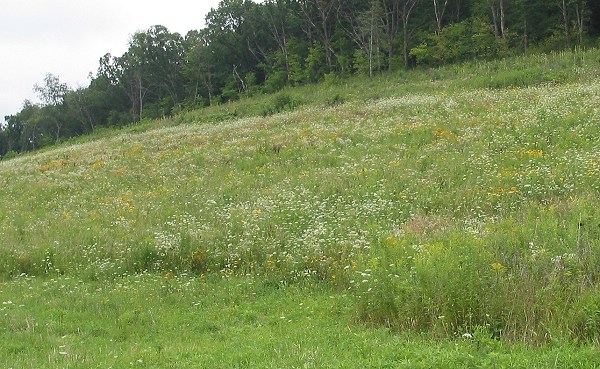 August 2003 -- Prairie plants are getting pretty well established, but we mowed again after this picture was taken to knock back the Fleabane and Queen Anne's Lace