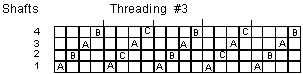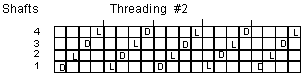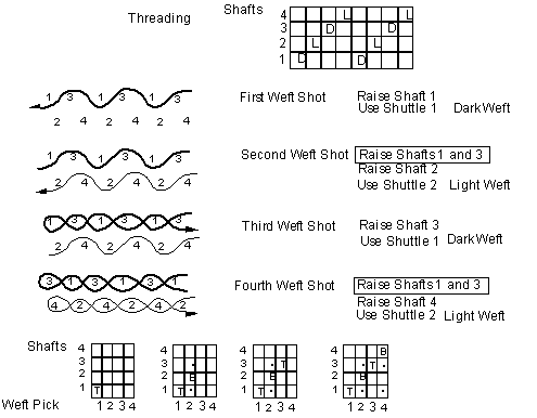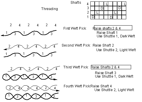 1. The threading is straight draw twill on four shafts. Dark warp threads on odd number shafts; light warp threads on even number shafts.