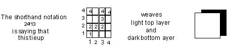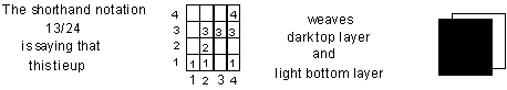 Instead of a single warp color combination which is true in single layer weaving, you the weaver have more choices for the warp color combinations in the top layer. The first line gives those choices and the weft color is added in the next line