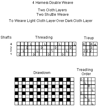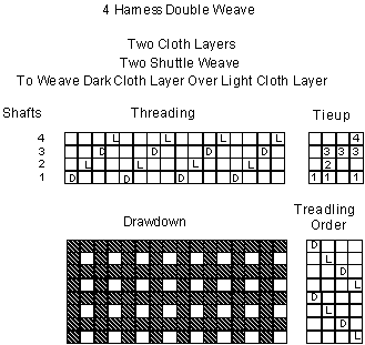The starting point is a 4 shaft threading, double weave tieup, treadling order and drawdown given in the next diagram. The dfirections for double weave are often presented in the following manner.