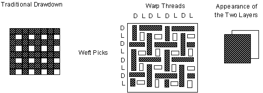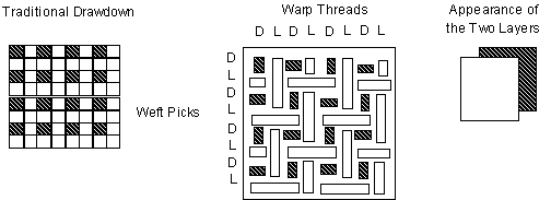 The traditional method for creating the drawdown shows all the warp and all the weft threads in one layer. What is needed is a way to make two drawdowns, one for the top cloth layer and the other for the bottom cloth layer. Most of the commercially available computer weave programs display the drawdown in this same fashion, as a single layer.