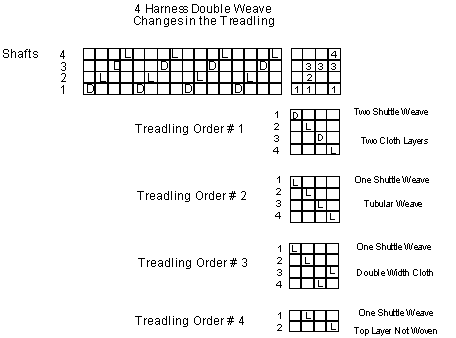 Changing the treadling order and the number of shuttles brings some rather startling changes. You can weave a tube rather than two cloth layers or you can weave a double width cloth, one of the most important tricks that double weave can do for you in that the "width" of your loom is suddenly doubled. The fourth treadling order allows you to weave the bottom layer of the cloth while the warp threads of the top layer float. Some interesting things can be carried out by needle weaving in those floats.