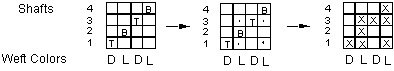 2. The tieup, basic double weave tieup # 1 in this example, weaves dark warp and dark weft in the top (T) cloth layer and light warp and light weft in the bottom (B) cloth layer.