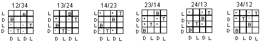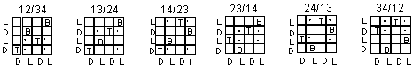 indicated vertically to the left and the colors of the weft threads are indicated horizontally across the bottom of each grid. To help you see what happens, two additional lines are presented below the six grids. The first line gives you the warp colors in the top and bottom layers (in the form DL/DL). The second line then adds the weft colors (in the form DL-DD/DL-LL) where the first two letters in each group of four identify the warp colors and the second two letters add the weft colors in that layer. Notice in these examples that the weft colors stay the same, always DD in the top layer and LL in the bottom layer. As you look at each of these tieup diagrams, say to yourself "I want warp threads on shafts 1 and 2 to be in the top layer and warp threads 3 and 4 to be in the bottom layer and the black dots show that I am raising shafts 1 and 2 out of the way when I weave in the bottom layer" and so on across the group.