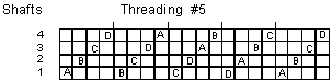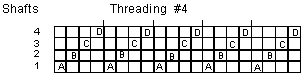 Warp 4 introduces a fourth color and the threading is a straight draw with the four colors ABCD. You can now use the six different tieups to control the warp color combinations in the top and bottom layers. A word of caution however until you have done some experimentation. The four colors should be about the same value and from neighboring color families or the four should be a single color of different values.