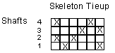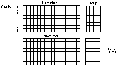 The procedure of writing out a threading, choosing an appropriate tieup, and selecting a treadling order in order to develop a drawdown is learned early by weavers. I want to use a diagram such as this one to serve as the framework for an understanding of double weave.