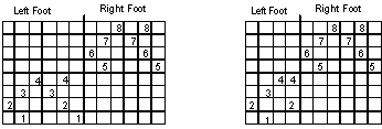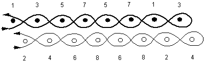 1. A skeleton tieup is very helpful for 8 shaft double weave. Unless you are fortunate to have 12 treadles on your 8 shaft floor loom, not even the skeleton tieup can give all the combinations that are needed. Here are two skeleton tieups, the first for floor looms with 12 treadles and the second for floor looms with 10 treadles. You have to retie your treadles on your 10 treadle loom to get the remaining combinations.