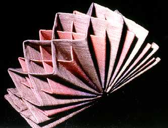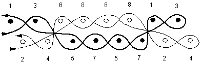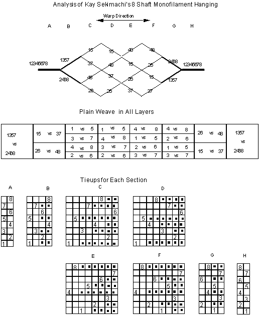 As a final example of multlayer weaves, an analysis of one of Kay Sekimachi’s beautiful weavings in monofilament nylon is shown on the next page. Schematically, all warp threads are woven in one layer, then divided into two layers and again into four layers. The four layers are interchanged several times before rejoining to weave two layers and finally back into a single layer. The threading is straight draw on 8 shafts and the numbers indicate the shafts that are combined in weaving the layers. The threads are spaced evenly wherever possible. The book keeping system helps to keep things in order.
