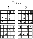 The threading and the treadling order do not need much comment beyond saying that the blocks can be threaded as the weaver desires to create wide or narrow windows, and treadled as the weaver desires to create tall or short windows. The tieup is where the action is. The tieup diagram has been expanded to make it easier to look at the four grids that make up the tieup.