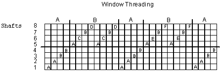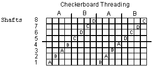 The first thing to do is prepare a new warp. Choose either the window or the checkerboard design and wind a warp about 3 yards long and 5-6" in width. Here are two suggested threadings with color indicated by the letters A,B,C.....