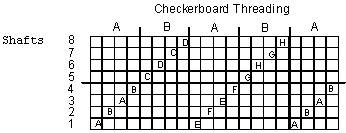 Tieup 1 has shafts 1-4 weaving a dark cloth layer on top and a light cloth layer on the bottom. and at the same time shafts 5-8 weave a light cloth layer on top and a dark cloth layer on the bottom. Tieup 2 reverses this so that shafts 1-4 weave a light cloth layer on top and a dark cloth layer on the bottom and shafts 5-8 weaves a dark cloth layer on the top and a light cloth layer on the bottm. The checkerboard pattern develops as the treadling order A switches to treadling pattern B and then back again.