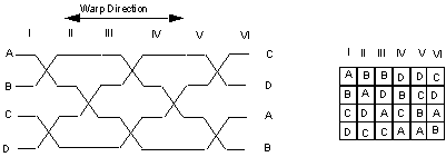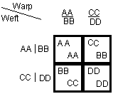 The warp combinations alternate in the vertical direction because the warp layers are interchanged. At the same time the weft combinations alternate in the horizontal direction because the threading blocks alternate between blocks A and B. (In the weaving the 4 x 4 grids join one another. They have been separated for clarity.)