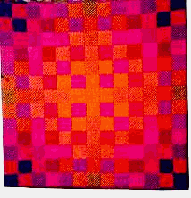 I find it is much more challenging to design a checkerboard because each section is adjacent to other colored sections on four sides while the windows are surrounded by the same background color. Five units have been chosen for the checkerboard to balance the design. I would suggest that the six colors be of approximately the same value and come from no more than 2 or 3 neighboring color families. Each threading unit has two colors which means that there are three warp color combination that you can choose, for example AA, AB, or BB. And don’t forget that you can use any of the six warp tieups to produce even more color variations in the windows or checkerboard designs. Look back at pages 10 and 11 in 4 shaft double weave to refresh your memory about the tieup possibilities. Later you may want to try a checkerboard warp with four colors in each threading unit.