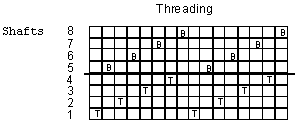 I find that it is very convenient to use your left foot to treadle shafts 1-4 and your right foot to treadle shafts 5-8. At times you have to press two treadles with one foot. I also suggest you rig the treadles to give all the combinations for shafts 5-8 because that is usually where you want to make the most color changes, at least with the window design.