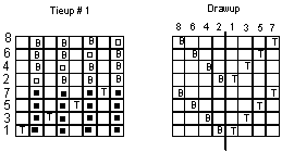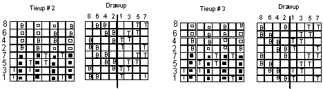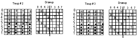 It will be easier now to develop the tieup for weaving 2/2 twill in each layer of the double width cloth. The threading is the same. Here are the two tieups and drawups.