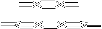 Another way to weave four layers is in the form of two double width layers. ThisPP permits me to insert a stiffener between the two layers and then hand sew the open selvage. I have used buckrum, aluminum metal, mylar film and wood as the stiffener to support three dimensional weavings. I also used the trick of weaving one double width layer inside another double width layer, bringing the hidden layer out into the open when I wanted it to be seen. Here are two diagrams for 8 shaft weaving which show what I have just described.