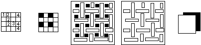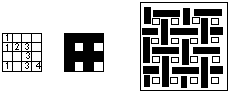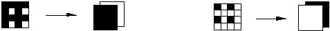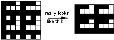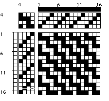 In double weave where two separate cloth layers are formed, there are no interlacings of the threads between the two layers. The problem is that a drawdown made in the usual manner shows all the threads of the two layers at the same time. The result gives a very misleading picture as shown in the next diagram. The diagram is for a 4-shaft loom, the warp is black and the weft is white, and the tieup and treadling are shown on the left.