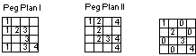 If the two basic peg plans for double weave are compared, there are certain things in common. Both have pegs in the four positions along the diagonal from upper left to lower right. Moreover there are no pegs in the four positions shown as zeros.