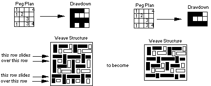 The drawdown numbered 5-24 from Appendix A serves as the example. The peg plan, drawdown and weave structure help to see what happens. Careful examination of the first weave structure on the left reveals that movement of rows 3 and 7 can occur, covering rows 4 and 8. The appearance of the drawdown and of the weave structure when viewed from above changes.