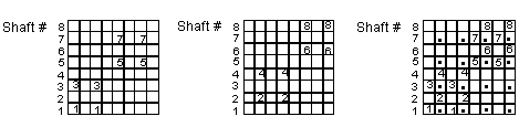 The tieup (or peg plan) is easy to develop. This example is for 2/2 basket weave in both layers of the double weave, with the dark warp threads 1357 in the top layer and the light threads 2468 in the bottom layer. The first diagram shows the shafts to be raised to weave the top layer and the second diagram shows the shafts to be raised to weave the bottom layer. The third diagram puts the first two together and adds with dots the shafts of the top layer that must be raised to weave the bottom layer.