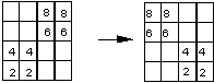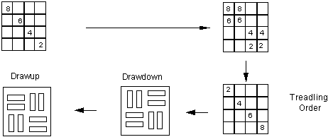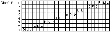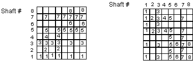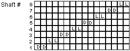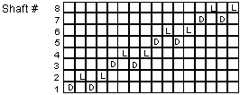 Now the path from threading to drawdown can be carried out for the bottom layer with the recognition that the threading diagram must be reversed because the warp runs 8642 from left to right when viewed from below rather than 2468 from right to left when viewed from above.