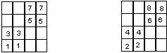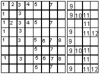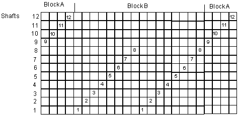 A border or frame can be added to any of the 8 shaft designs already presented. An easy way to accomplish this is to designate shafts 9-12 for block A and shafts 5-8 for block B. Then any of the 8 shaft peg plans given in the last section can be used directly. The threading would have this two block threading format. Notice that it is possible to have plain weave structure in both blocks A and B. Block B can also be woven in basket weave.