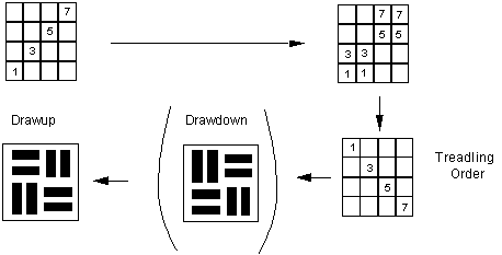 The usual method of progressing from the threading to the tieup, to the treadling, to the drawdown looks like this. The drawup is also shown because that is what a weaver see as the weaving develops on the loom.