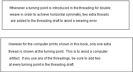 RULE. Remember two extra warp threads are needed at the turning point for horizontal symmetry and two extra treadlings or peg plans are needed at the turning point for vertical symmetry.