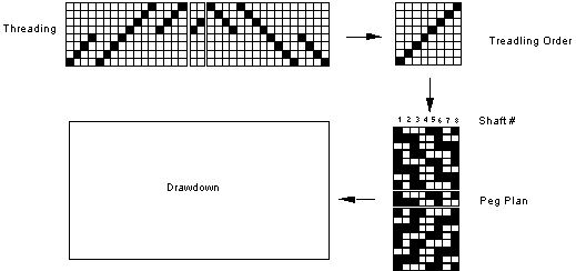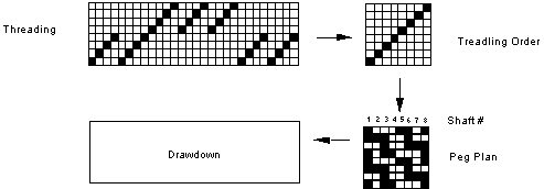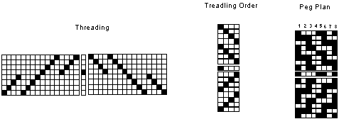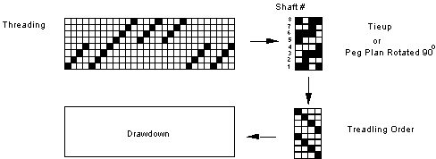 All floor loom weavers soon become familiar with the format for making a drawdown: from the threading to the tieup to the treadling order to the drawdown. Figure 4 gives an example (without the actual drawdown!) which could be used with a treadle loom, a table loom, or a dobby loom.