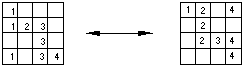 A basic element in network drafting is the transition that occurs from one weave structure to another weave structure. The pattern line provides a very efficient way to derive the threading and the peg plan for this transition. I would like to present another method that looks at the peg plan in a more general manner. In double weave there are six different peg plans giving different combinations of the four warp threads in the two layers. The discussion here is limited to Peg Plan I (dark top layer, light bottom layer) and Peg Plan II (light top layer, dark bottom layer). The transition between the two peg plans is given in figure 7. The numbers used in the peg plans are for shafts 1-4 but of course the diagrams are applicable to other shafts.