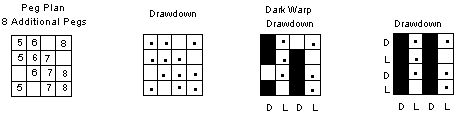 different peg plans for double weave. These peg plans are given in Appendix A-1 with their drawdowns and A-2 with their drawups.. Let me show the drawdowns for two of the 256 peg plans, the first where no additional pegs are added to figure 8 and the second where eight additional pegs have been added. The procedure I use for drawdowns is presented in figure 9. The peg plan comes first and next a diagram where dots replace the numbers. The third diagram is a warp drawdown for the dark warp threads (a jack loom with rising shed is assumed). In the final square, dark weft threads complete the drawdown. (An empty square indicates a light weft thread in the top layer and a square with a black dot stands for a light warp thread also in the top layer.)