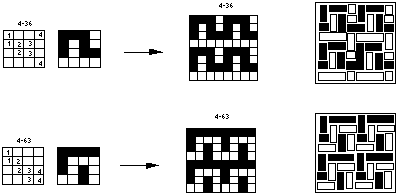 The drawdowns in Appendix A-1 are all one unit on a side. More revealing are drawdowns of two units on a side and these are given in Appendix B-1. Notice that there are far fewer than 254 distinct designs and they have been grouped in Appendix B-1 to emphasize this. Some are shifted up or down by a few threads. Others are the positive-negative images of each other. In figure 10 the drawdowns and weave structures for the tieups numbered 4-36 and 4-63 are shown. The drawdowns come from Appendix A-1 and the 4 unit drawing from Appendix B-1.