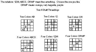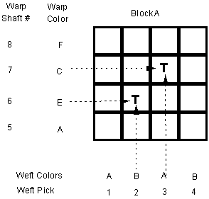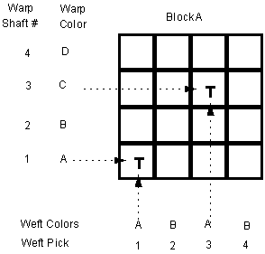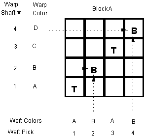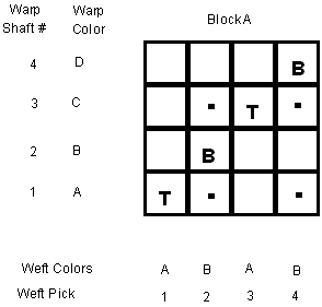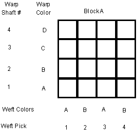 1. Draw a 4 x 4 grid and label it block A with warp shaft numbers and warp colors on the left of the grid. I have chosen four colors A,B,C, and D for the warp. You may find it easier to use colors such as R for red, O for orange, and so on. Label weft pick numbers and weft colors across the bottom of the grid. I have arbitrarily chosen two of the warp colors A and B for the weft colors. Other colors could of course be chosen. The weft order is always the same. ABAB. (Why? Then in multiblock weaving, the weft will weave properly in all blocks no matter how many tieup changes you decide to make.)