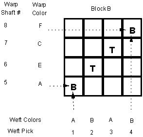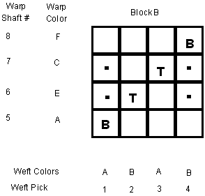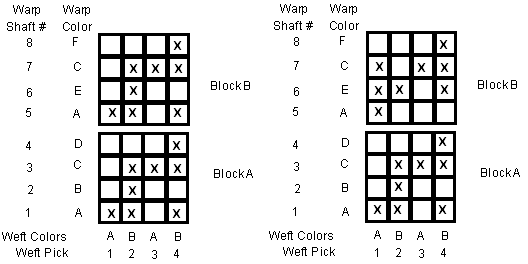 The warp colors have been changed. The weft pick #’s and colors stay the same because blocks A and B are to be woven at the same time.
