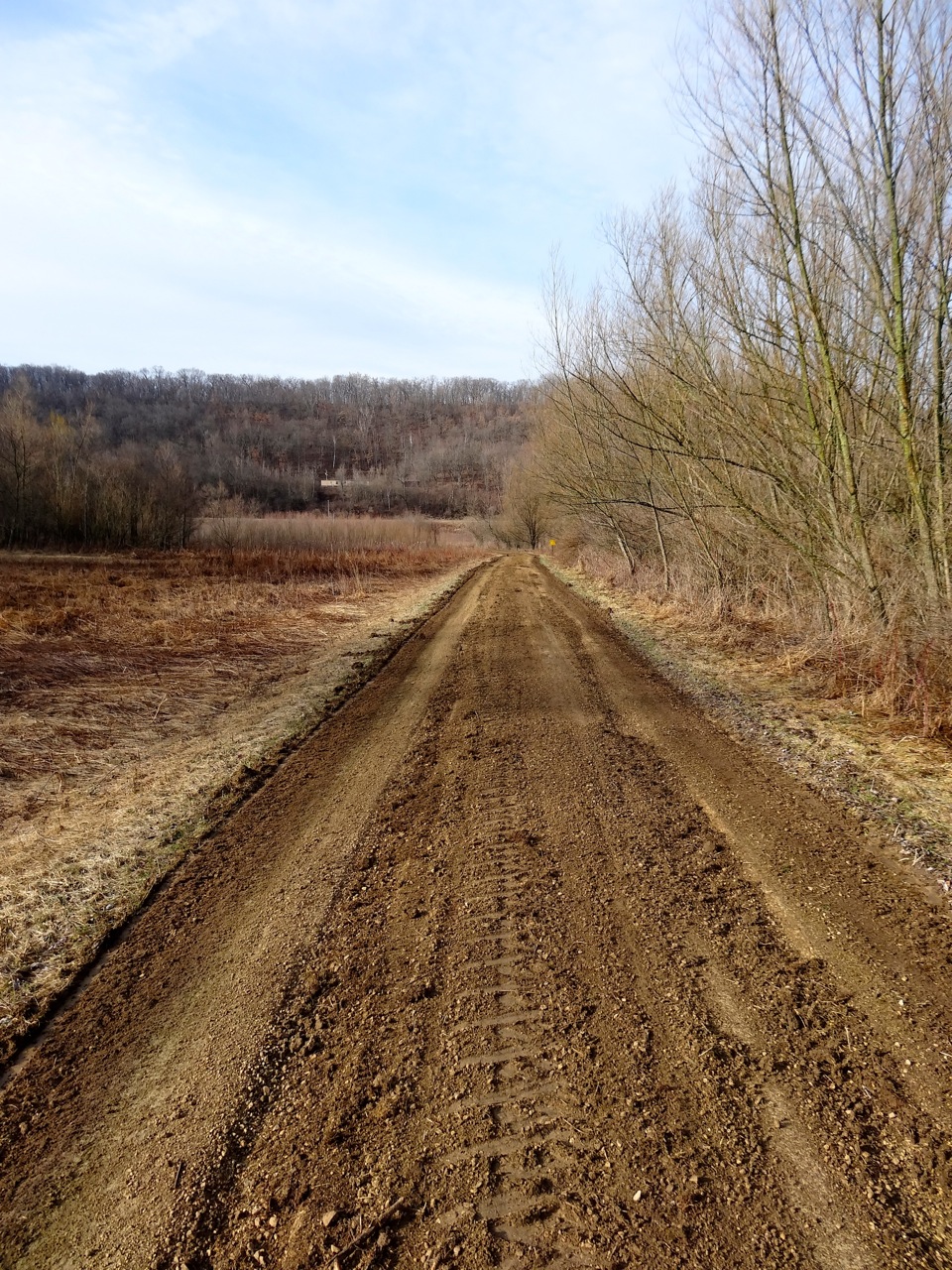 This is a piece of road we hardly ever use. It was built so that semis can turn around when they get in here (useful for when we were building the house, and for grain trucks when we were still renting the land for row crops). But most of the time it just sits there, and you can see that it likes to be covered with grass.